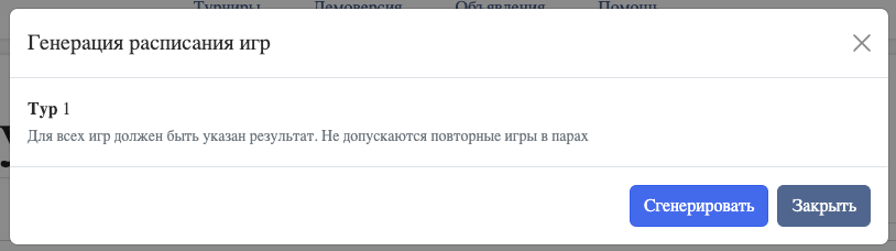 Отобразится окно генерации игр. Генерация происходит для следующего тура, для всех текущих игр