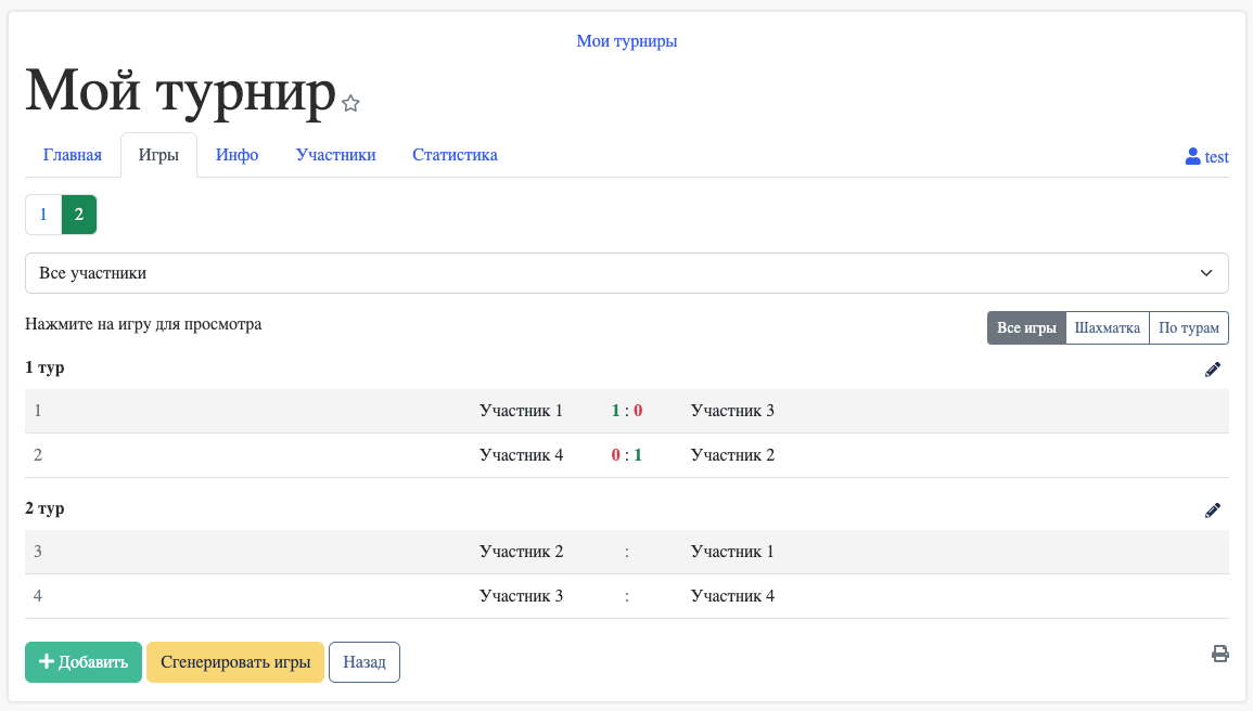 Ваш турнир готов! Теперь можно заполнять результаты игр для кажого тура, после чего будет возможна генерация игр следующего тура.
